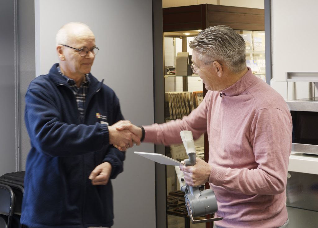 Links op de foto’s de overhandiging van het stuur door Hans Ekhart aan SHVV-voorzitter Marco Borst (foto Diederik Wurtz). Rechts de vitrine waarin het stuur is opgenomen. De maquette van de 257 op zee is gemaakt door Gerrit Sterken.